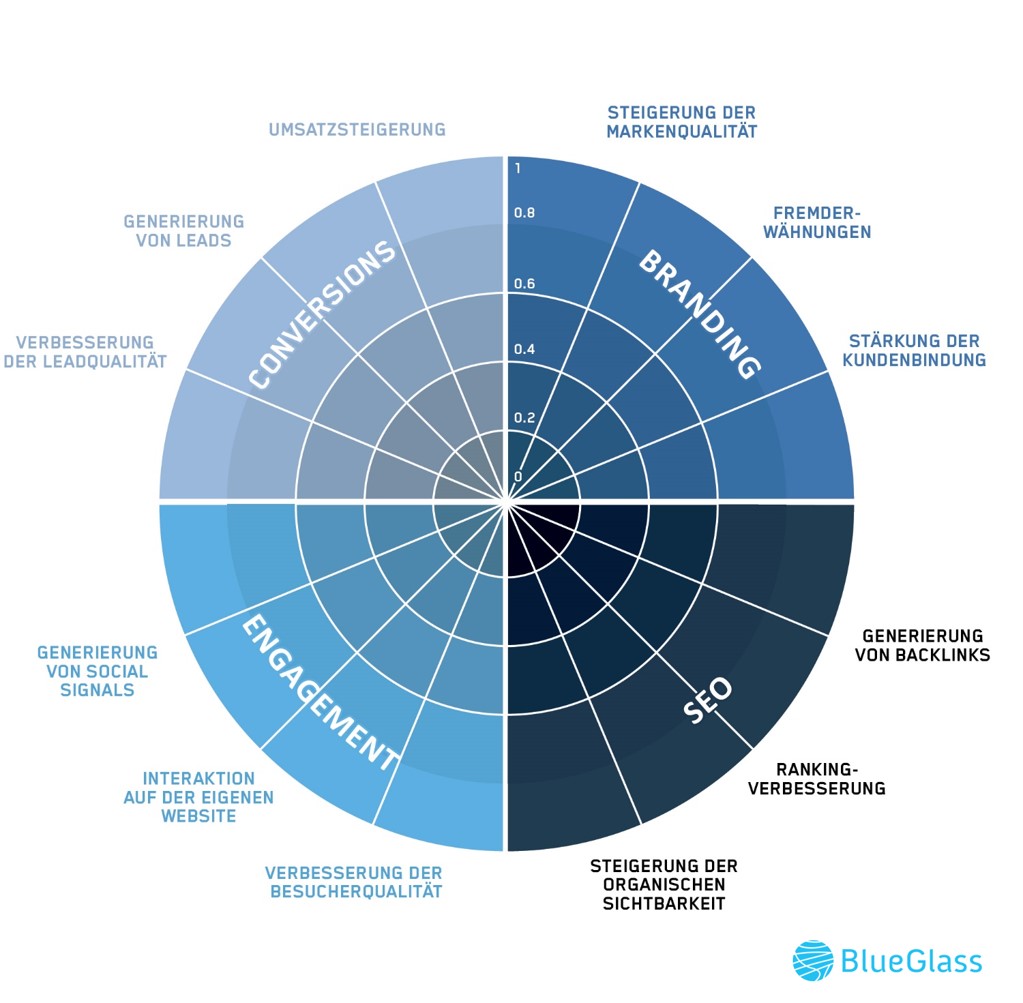 Um die möglichen Ziele eines Content-Marketing-Projektes besser zu ordnen und Unternehmen ein Orientierungsinstrument an die Hand zu geben, wurde dazu im Auftrag der Online-Marketing-Agentur BlueGlass Interactive an der Hochschule Luzern von Rahel Egli (Projektmanagerin E-Commerce bei Calida, Twitter: @rahelegli) eine Studie zur Wirkungsmessung durchgeführt (Content Marketing: Nutzen-Operationalisierung einer multidisziplinären Strategie).