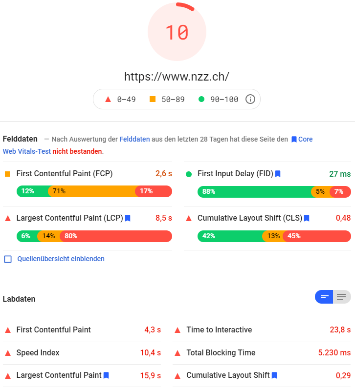 Bei nzz.ch haben wir sowohl das Problem mit dem CLS wie auch mit den Ladezeiten. Die Probleme unterscheiden sich nicht stark zu denen von TCS und Orell Füssli, darum werden wir hier nicht weiter darauf eingehen.