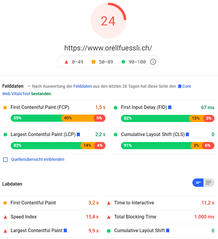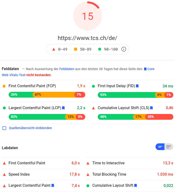 Was auffällt: Der CLS weist einen guten Wert auf. Das ist gemäss unserer Erfahrung bei Webseitenbetreiber eine Seltenheit. Well done!
