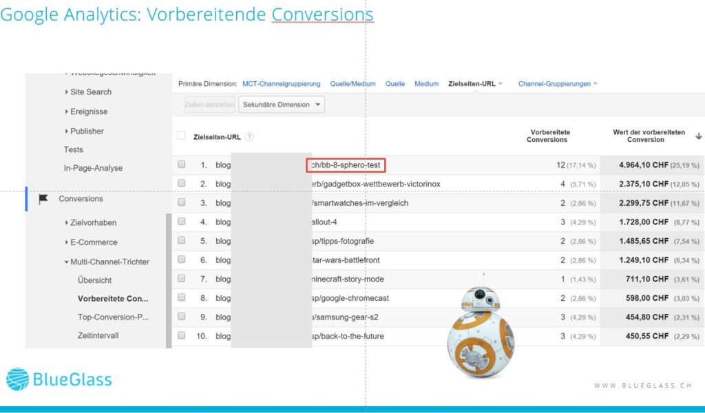 Besser geeignet ist der Total Conversion Value: Er misst, über welche Sessions und die entsprechenden Einstiegsseiten die grössten Umsätze generiert wurden (Total Conversion Value = Transaktionsumsatz + Gesamtzielwert + vorbereitende Conversions).