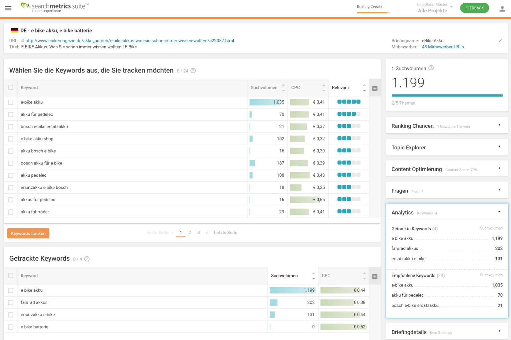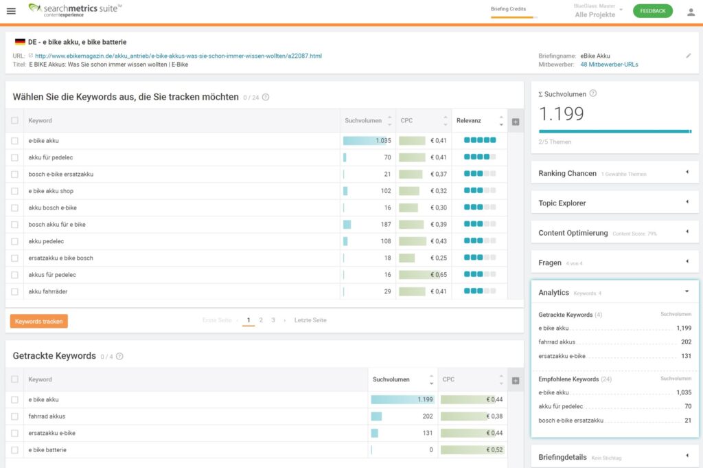 In der Searchmetrics Content Experience können die relevanten Werte visuell eingesehen und in ein Content-Briefing übernommen werden. Inklusive Ranking-Monitoring, wenn die neuen Inhalte einmal aufgeschaltet wurden.