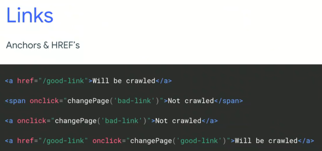 Nach wie vor besonders problematisch für Suchmaschinen sind aber JavaScript-Links. An der Entwicklerkonferenz I/O hat Google letztes Jahr klar gemacht, dass sie nur HTML-Links crawlen. Genauer gesagt: Nur wenn ein Anchor-Tag (<a>) zusammen mit einem href-Attribut inkl. URL als Wert auftritt, handelt es sich um einen Link, der von Google gecrawlt wird. Beispielsweise werden Links, die ausschliesslich über eine Onclick-Funktion gesteuert werden, nicht gefolgt.