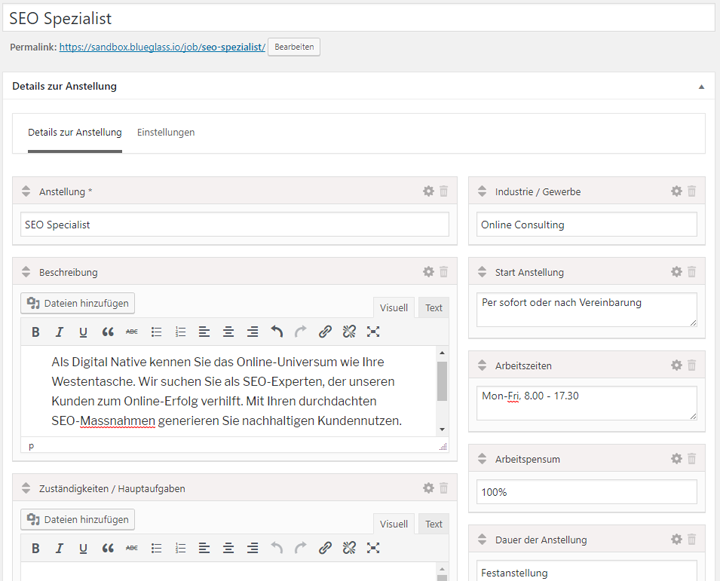 Will man einen neuen, offenen Job ausschreiben, stehen alle nötigen Felder strukturiert zur Verfügung.
