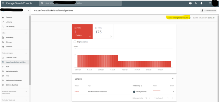 Im Google Search Console Bericht “Nutzerfreundlichkeit auf mobilen Endgeräten”  werden konkrete Fehlermeldungen angezeigt, die zu beheben sind. Zudem sieht man in diesem Bericht auch, ob die Umstellung auf den Smartphone-Crawler bereits erfolgt ist.