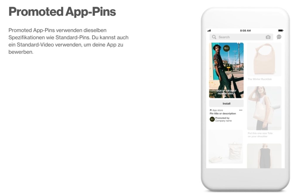 Promoted Pins sehen im Home Feed und in den Suchergebnissen nahezu exakt so aus wie ein normaler Pin. Äusserlich unterscheidet sich nur das Label “Promoted”. Auch ihre Funktionen sind gleich.