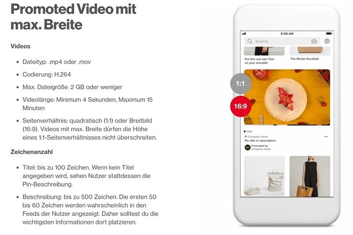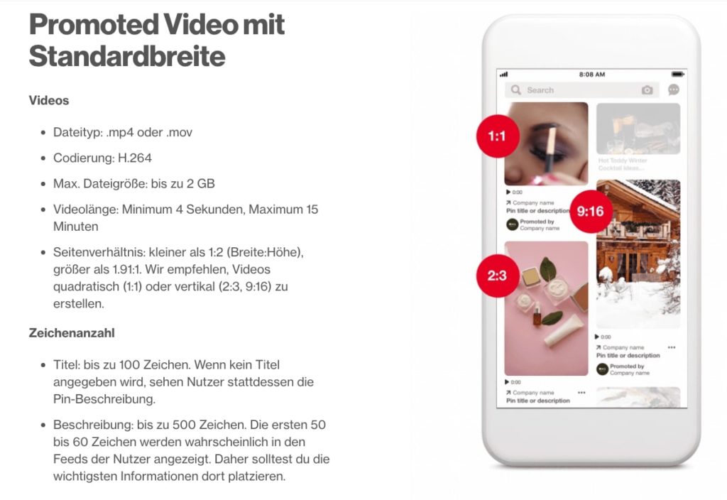Promoted Video Pins können in zwei Varianten eingebucht werden: Standardbreite und maximale Breite.