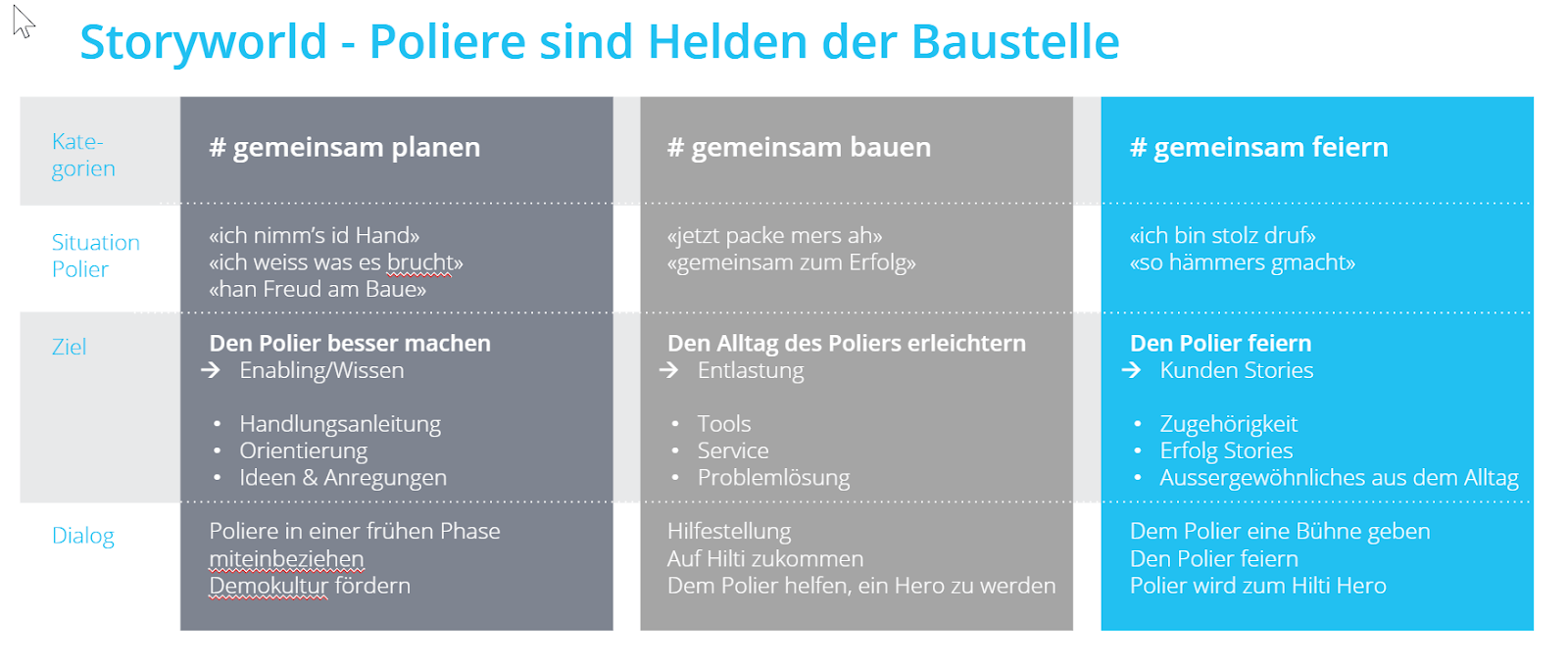 Die Hilti AG ist ein Werkzeughersteller und Weltmarktführer in der Befestigungs- und Abbautechnologie für Bauprofis. Hilti hat uns beauftragt, die Zielgruppe Poliere mittels Content Marketing anzusprechen und für Hilti Verbrauchsmaterialien zu sensiblisieren. Dabei wurden folgende Ziele definiert: