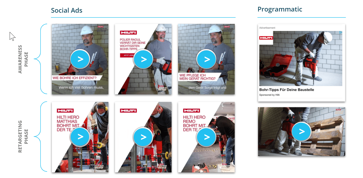 Dafür ergänzten wir das Targeting durch Interessen und erstellten so ein interessenbasiertes Profil von Polieren. Zusätzlich wurden anonyme Lookalike Audiences gebildet (Gruppen und User, welche ein ähnliches Profil haben wie Hilti Bestandskunden).