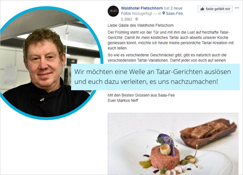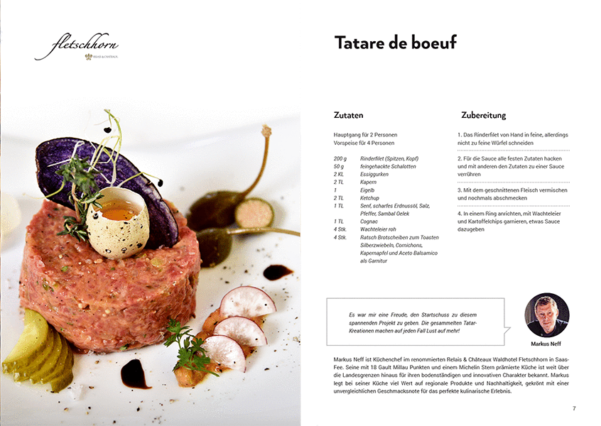 Via Facebook-Seite des Waldhotel Fletschhorn präsentiert Neff nicht nur sein eigenes Tatar-Rezept, er ruft auch die renommierten Foodblogger David Schnapp von Das Filet und Christian Franck von Food Freaks dazu auf, ihre eigenen Tatar-Kreationen zu teilen.